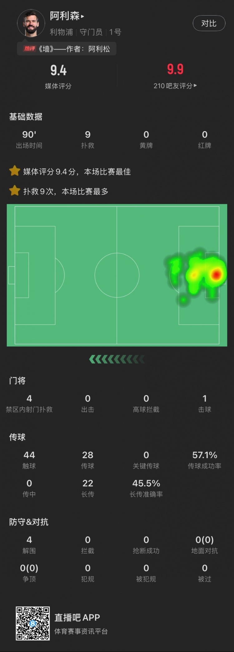 3月6日訊 在剛剛結(jié)束的歐冠1/8決賽中,利物浦1-0絕殺巴黎。本場(chǎng)比賽,巴黎狂轟27腳射門(mén)、10腳射正,均被阿利森化解。他獲得了9.4分的評(píng)分,全場(chǎng)最高。
