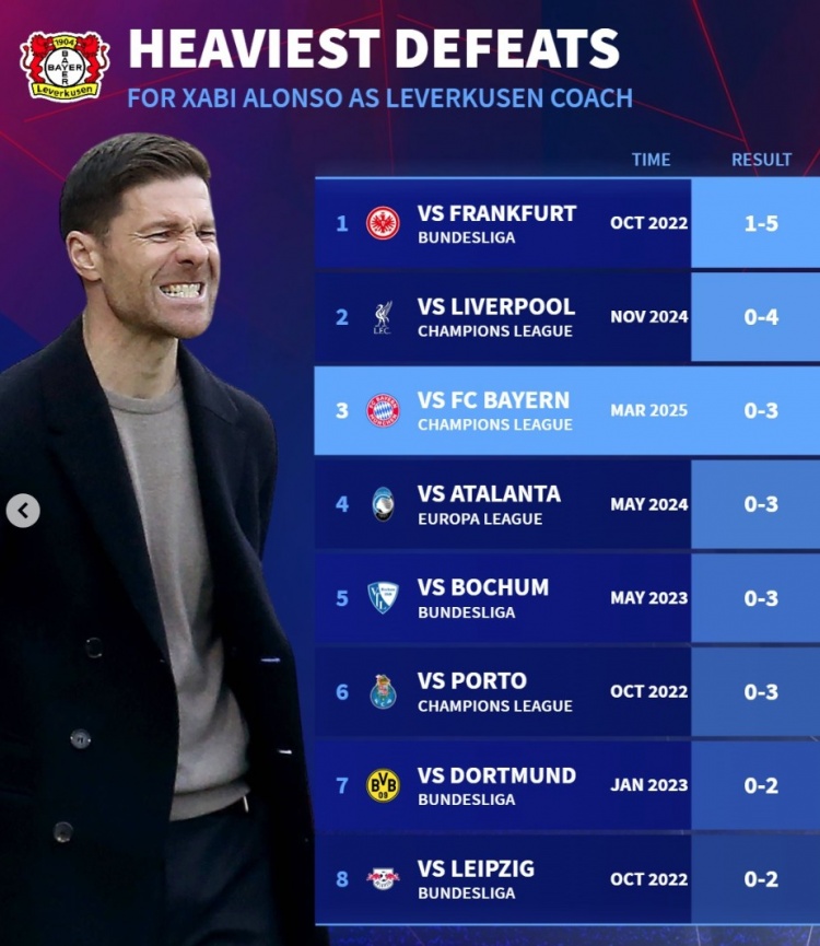 3月6日訊 勒沃庫森在本輪歐冠0-3完敗拜仁,《轉(zhuǎn)會市場》也列出了阿隆索執(zhí)教后的勒沃庫森最大比分失利情況。