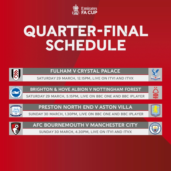 3月6日訊 今天,英足總在官網公布了足總杯1/4決賽的比賽時間,伯恩茅斯對陣曼城的比賽將于3月30日晚23:30打響。2025年3月29日,星期六富勒姆VS水晶宮(北京時間19:15)2025年3月30日,星期日布萊頓VS諾丁漢森林(北京時間00:15)普雷斯頓VS阿斯頓維拉(北京時間20:30)伯恩茅斯VS曼城(北京時間23:30) 本文標簽: 足球 英超 伯恩茅斯 曼城 諾丁漢森林 富勒姆 布萊頓 阿斯頓維拉 水晶宮