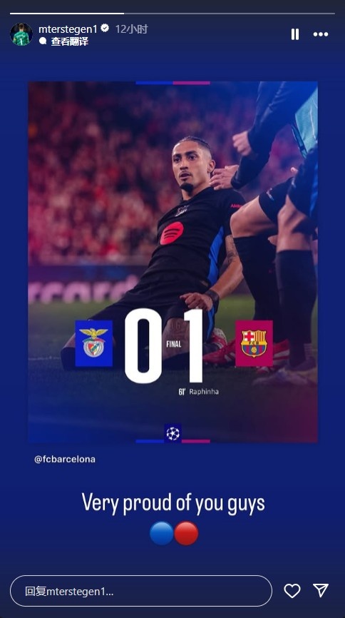 北京時(shí)間周四凌晨,巴薩客場(chǎng)1-0戰(zhàn)勝本菲卡,拉菲尼亞打進(jìn)制勝球。賽后,巴薩門將特爾施特根在個(gè)人社交媒體上曬出了本場(chǎng)比賽結(jié)果,并配文:“為你們而感到驕傲?!?/p>