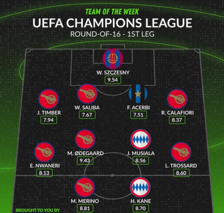 3月6日訊 數(shù)據(jù)網(wǎng)站W(wǎng)hoscored盤點了本輪歐冠評分最高陣容,其中取得7-1大勝的阿森納有7人入選,門將位置什琴斯尼力壓阿利森在列,具體陣容如下: