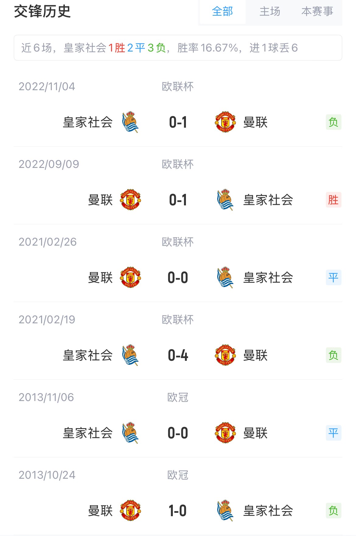 曼聯(lián)與皇家社會共交手過6次,曼聯(lián)3勝2平1負(fù)。此外,本賽季歐聯(lián)杯,曼聯(lián)目前是唯一一支不敗球隊,他們聯(lián)賽階段5勝3平。