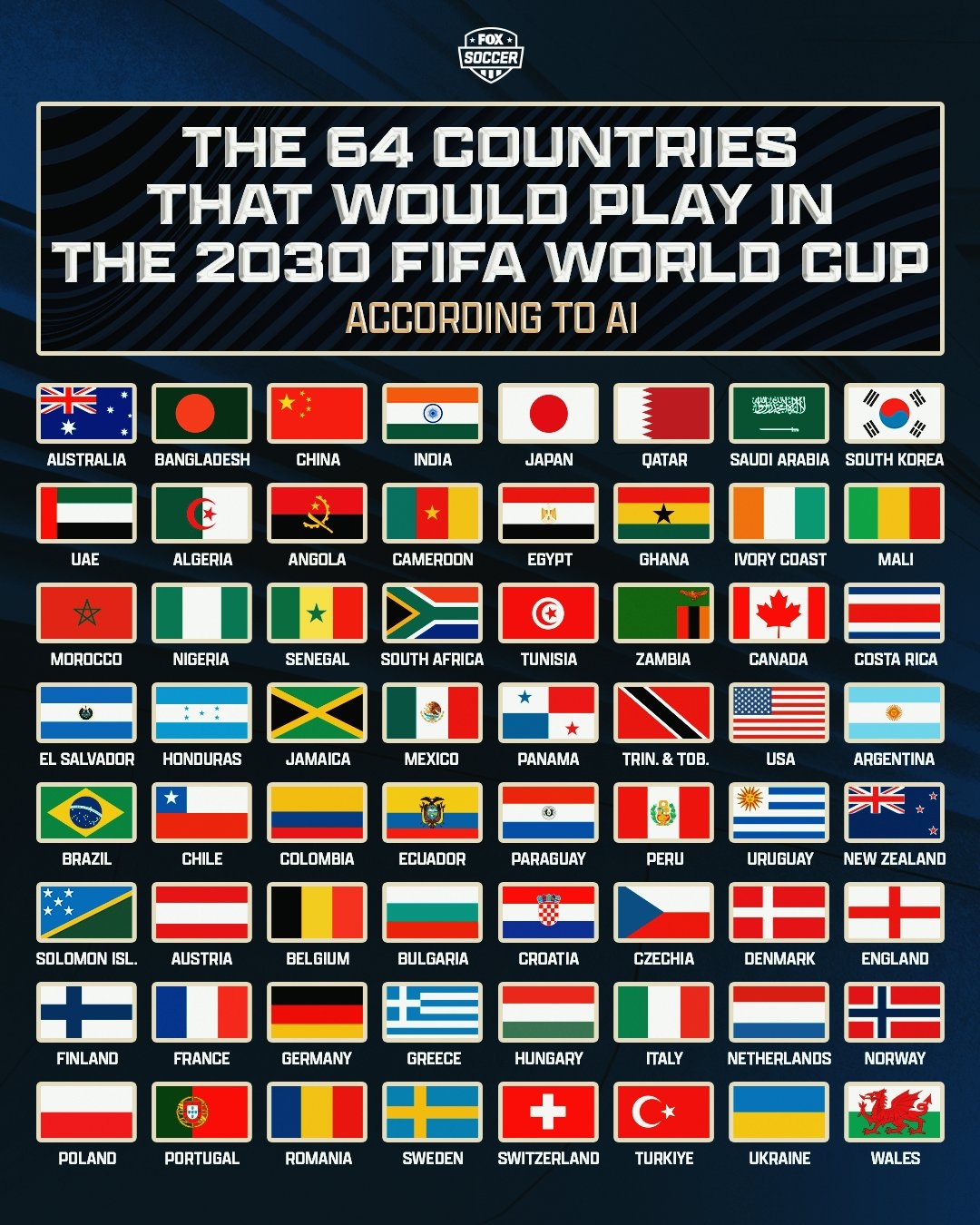 ??怂棺闱虬l(fā)文,表示要求ChatGPT列出如果2030世界杯擴軍64支隊后所有的64個國家。同時??怂箤懙溃耗阌X得這種形式是個好主意嗎?