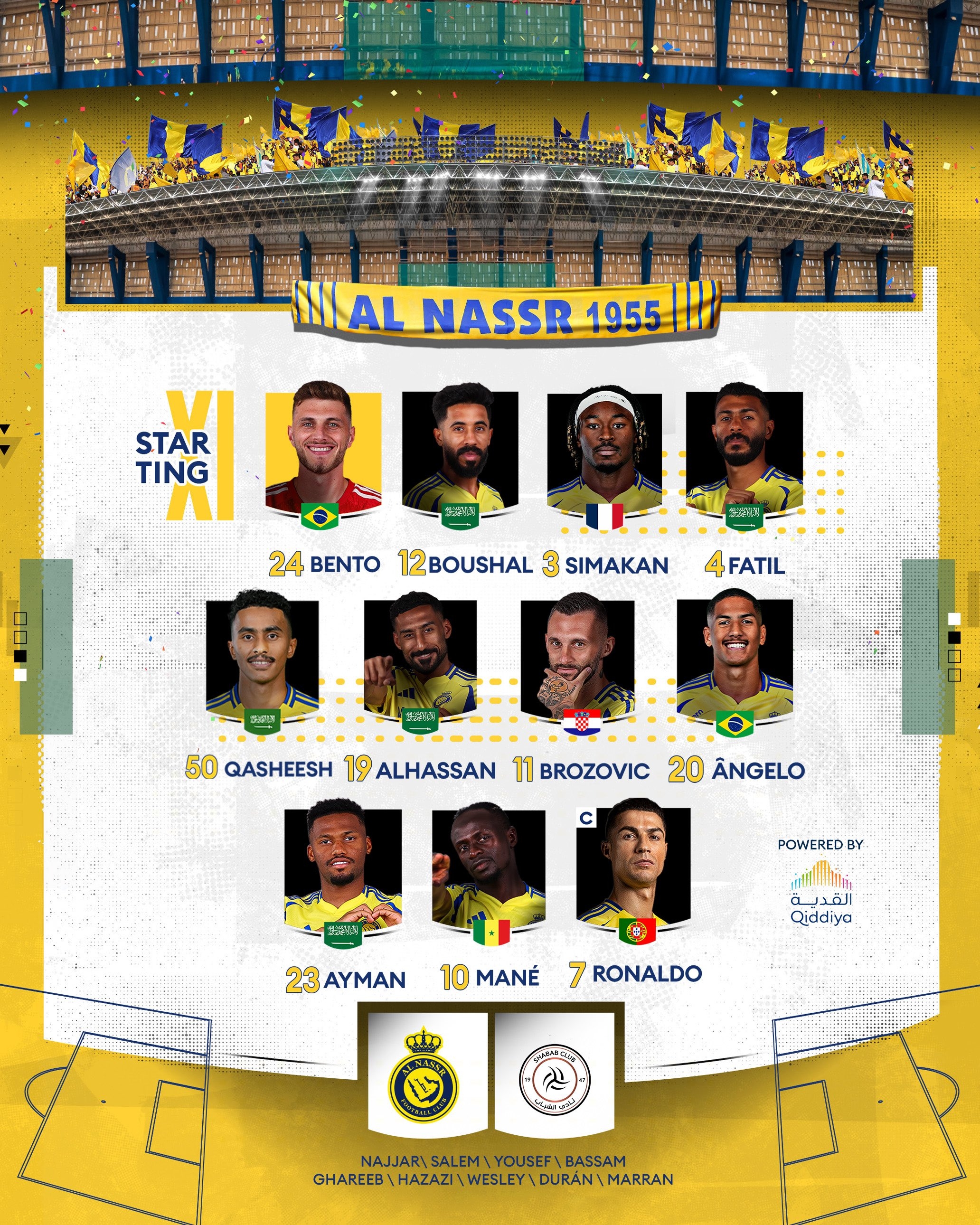 利雅得青年人替補(bǔ):33-邁伊沃夫、5-阿爾沙里、12-卡納巴、17-尚吉蒂、21-薩迪、34-杜拜、38-哈布什、70-卡馬拉、71-阿爾泰恩