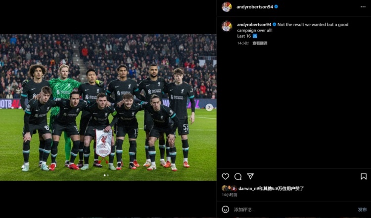 1月30日訊 今天凌晨結(jié)束的歐冠聯(lián)賽階段最后一輪比賽中,利物浦2-3不敵埃因霍溫,無緣全勝出線,但仍以榜首身份晉級。賽后,羅伯遜更新了社媒。