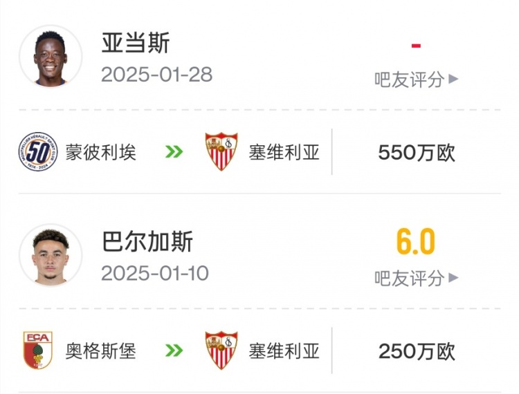 塞維利亞目前以800萬歐領(lǐng)跑西甲轉(zhuǎn)會支出,他們550萬歐引進蒙彼利埃前鋒亞當斯,250萬簽下奧格斯堡邊鋒魯本-巴爾加斯。