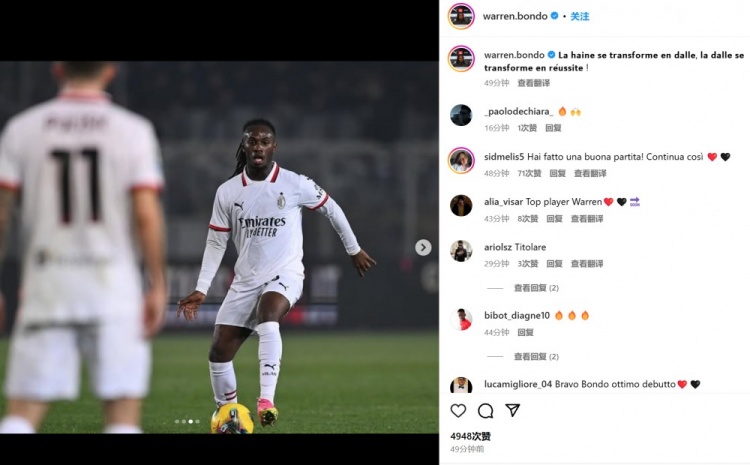 3月9日訊 米蘭在本輪意甲3-2逆轉(zhuǎn)擊敗萊切,冬窗新援邦多首發(fā)出戰(zhàn)。邦多在冬窗以1000萬歐元從蒙扎加盟后,因傷休戰(zhàn)至今,他也在本場比賽完成了米蘭首秀。邦多也在賽后通過社媒曬出自己的比賽照,并引用了一段法語嘻哈歌曲的歌詞配文:“仇恨轉(zhuǎn)化為渴望,渴望轉(zhuǎn)化為成功”。 本文標(biāo)簽: 足球 意甲 AC米蘭 萊切