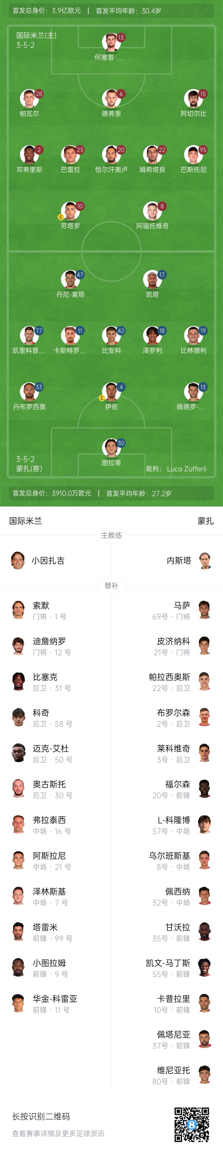 國米替補(bǔ):1-索默、12-迪詹納羅、7-澤林斯基、9-圖拉姆、11-科雷亞、16-弗拉泰西、21-阿斯拉尼、30-奧古斯托、31-比塞克、50-艾杜、58-科基、99-塔雷米