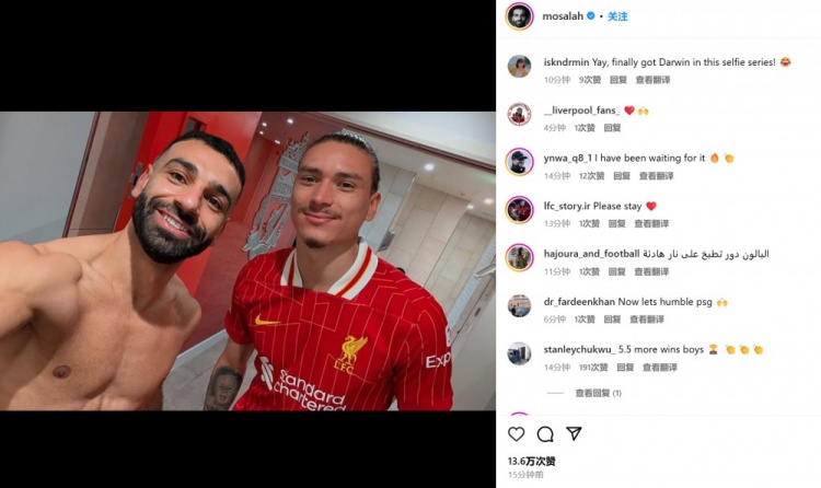 薩拉赫在本賽季比賽后通常都會(huì)曬出自己和進(jìn)球隊(duì)友的合照,球迷們也調(diào)侃道:“終于輪到努涅斯了?!?/p>