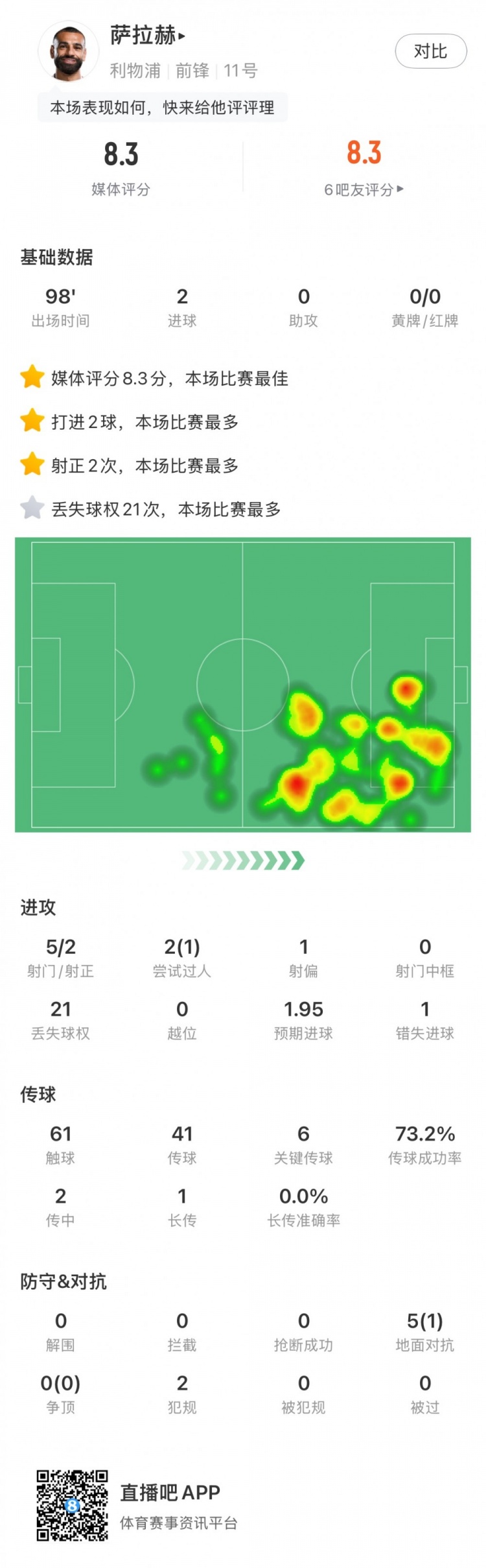 出場時(shí)間98分鐘,進(jìn)球2個(gè)