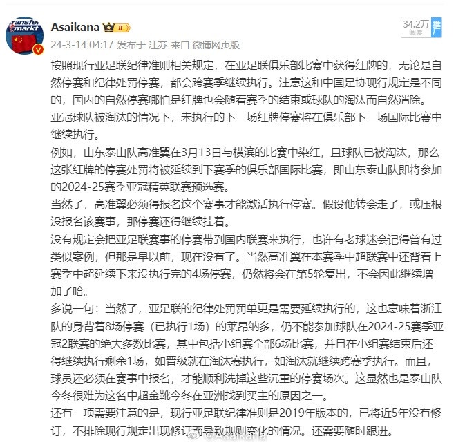 而亞足聯(lián)則相反,紅牌自然停賽需要跨賽季執(zhí)行?,F(xiàn)中足聯(lián)和中國足協(xié)已經(jīng)分家,中足聯(lián)目前還是和中國足協(xié)保持一致,如果中足聯(lián)日后出臺與之不同的新的停賽執(zhí)行細則,職業(yè)聯(lián)賽范疇內(nèi)當然也是要以中足聯(lián)的規(guī)定為準。