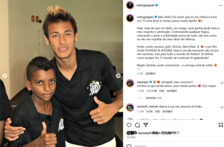 1月31日訊 內(nèi)馬爾自宣回歸桑托斯,羅德里戈曬出了15年前在內(nèi)馬爾在桑托斯的合照,向內(nèi)馬爾送上了祝福。