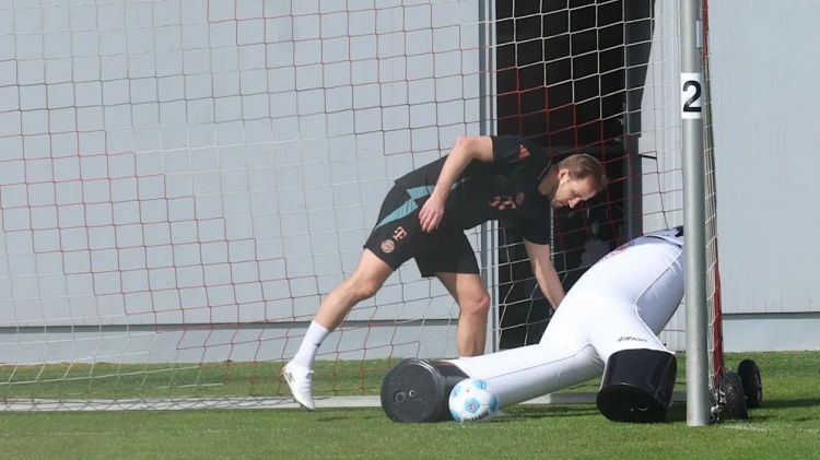 該媒體指出,拜仁大部分球員都選擇留在室內(nèi)進(jìn)行恢復(fù)性訓(xùn)練,但凱恩和奧利塞選擇來(lái)到訓(xùn)練場(chǎng)加練射門。盡管沒有門將球員協(xié)助,但他們借用了兩個(gè)充氣玩偶在球門位置鎮(zhèn)守。