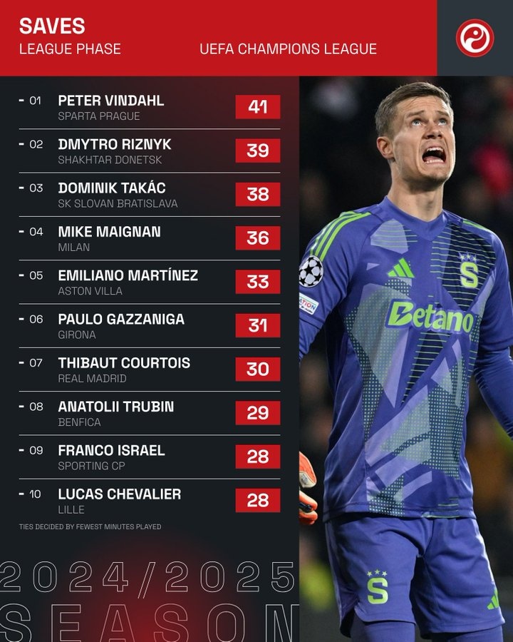 1月31日訊 Squawka統(tǒng)計了本賽季歐冠至今的撲救榜,布拉格斯巴達門將文達41次撲救居首。