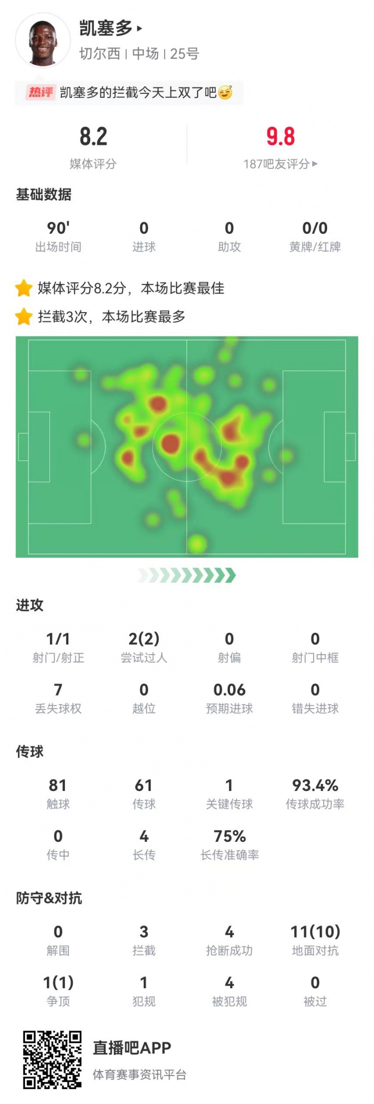 3月10日訊 切爾西在本輪英超1-0力克萊斯特城,凱塞多本場數(shù)據(jù)如下:首發(fā)踢滿90分鐘預(yù)期助攻0.4281觸球61傳球、57成功,成功率93%1關(guān)鍵傳球4長傳、3成功1射門、1射正2過人、2成功12對抗、11成功7丟失球權(quán)1犯規(guī)4造犯規(guī)3攔截4搶斷0被過獲評8.2分最高 本文標(biāo)簽: 足球 英超 切爾西 萊斯特城