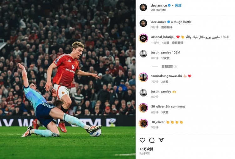 賴斯也通過(guò)社媒曬出自己倒地放鏟破壞霍伊倫單刀球的瞬間照,并配文:“一場(chǎng)艱難的戰(zhàn)斗?!?/p>