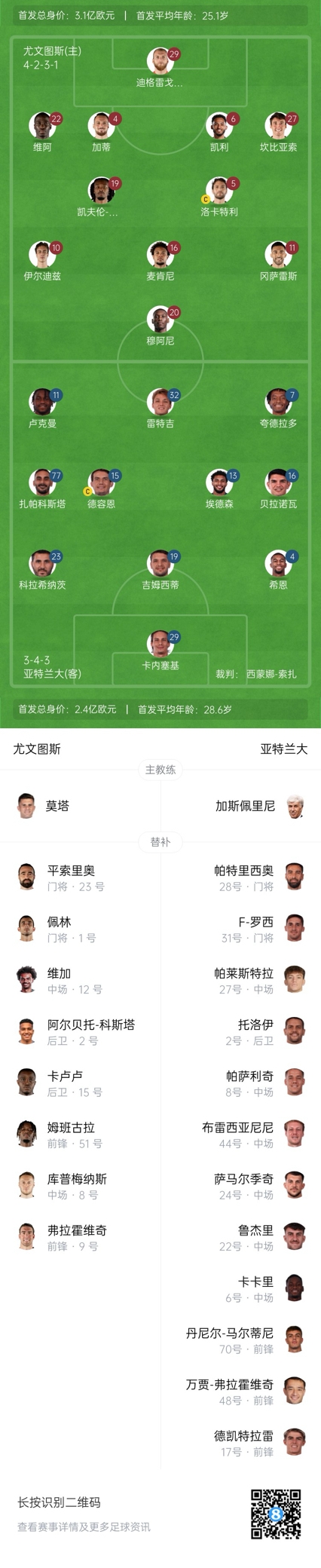 亞特蘭大替補(bǔ):28-帕特里西奧、31-F-羅西、2-托洛伊、22-魯杰里、6-卡卡里、8-帕薩利奇、24-薩馬爾季奇、44-布雷西亞尼尼、17-德凱特拉雷、27-帕萊斯特拉、48-萬(wàn)賈-弗拉霍維奇、70-丹尼爾-馬爾蒂尼