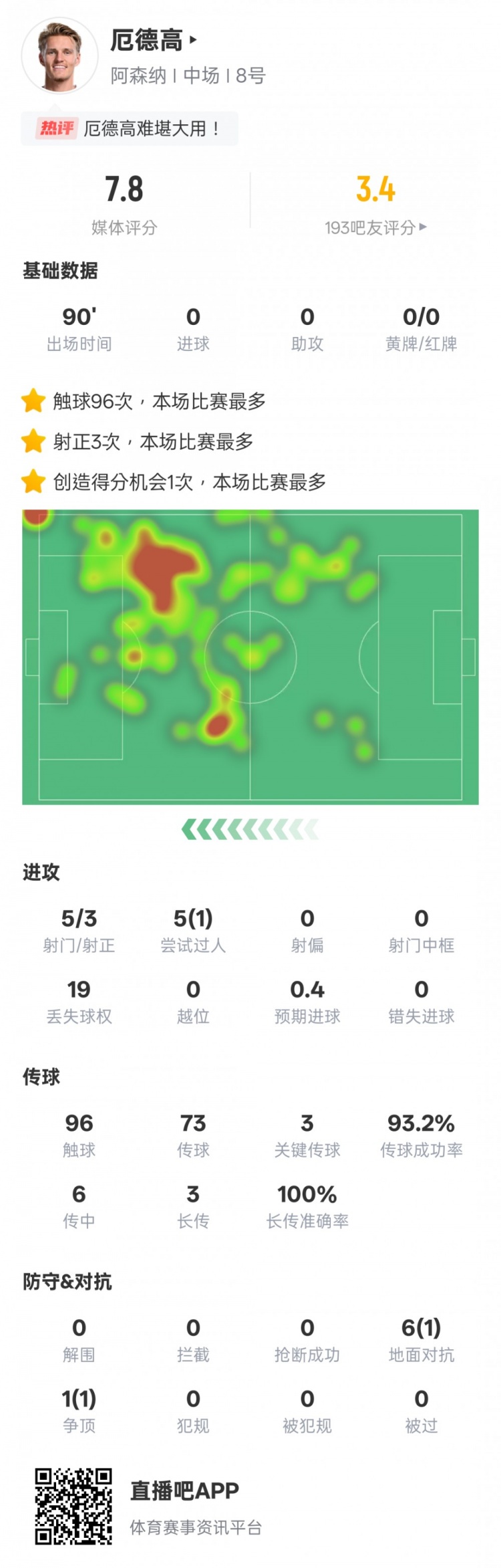 3月10日訊 英超第28輪,阿森納客場1-1曼聯(lián),厄德高首發(fā)出戰(zhàn),貢獻(xiàn)3次關(guān)鍵傳球,創(chuàng)造1次進(jìn)球機(jī)會(huì),傳球成功率93.2%,但也有19次丟失球權(quán),評(píng)分7.8。