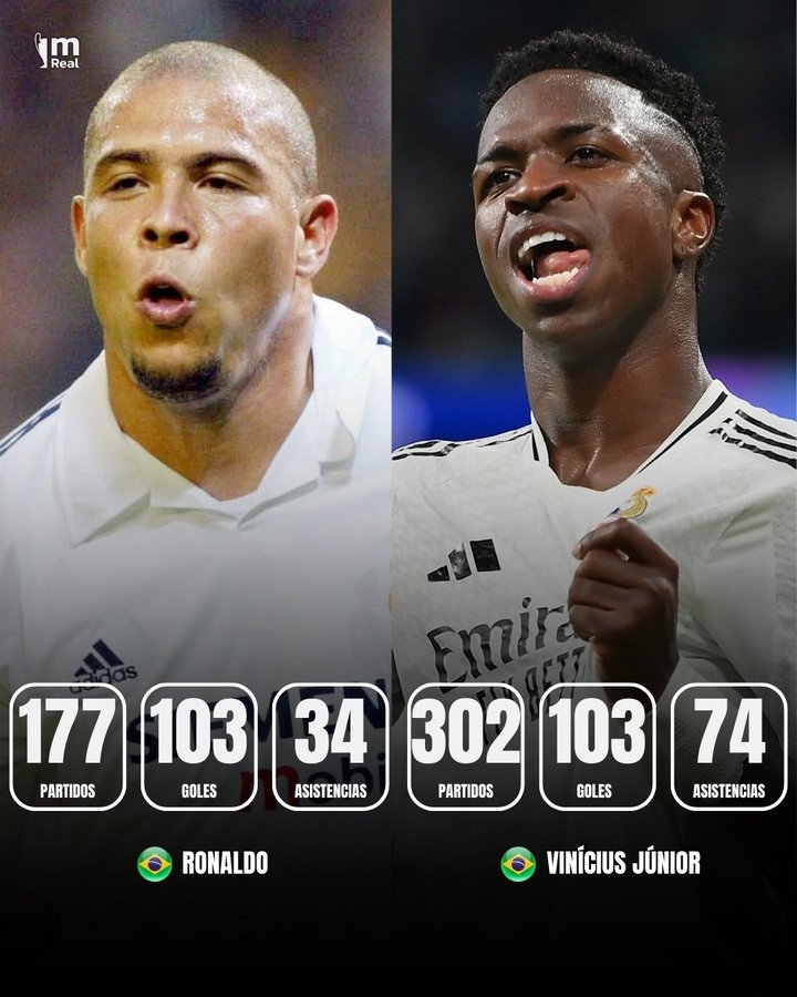 3月10日訊 本輪西甲,皇馬2-1擊敗巴列卡諾,維尼修斯打進一球。統(tǒng)計表明,維尼修斯現(xiàn)在已經(jīng)為皇馬打進103球,追平同胞羅納爾多,成為皇馬隊史進球并列最多的巴西球員。維尼修斯&羅納爾多皇馬數(shù)據(jù):維尼修斯302場103球74助羅納爾多177場103球34助 本文標簽: 足球 皇家馬德里 西甲