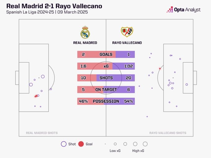 OPTA統(tǒng)計(jì)表明,本場(chǎng)比賽巴列卡諾有20次射門,而皇馬只有10次,這是除了面對(duì)巴薩之外,皇馬自2008年1月以來(lái)在西甲主場(chǎng)與對(duì)手最大的射門次數(shù)差。