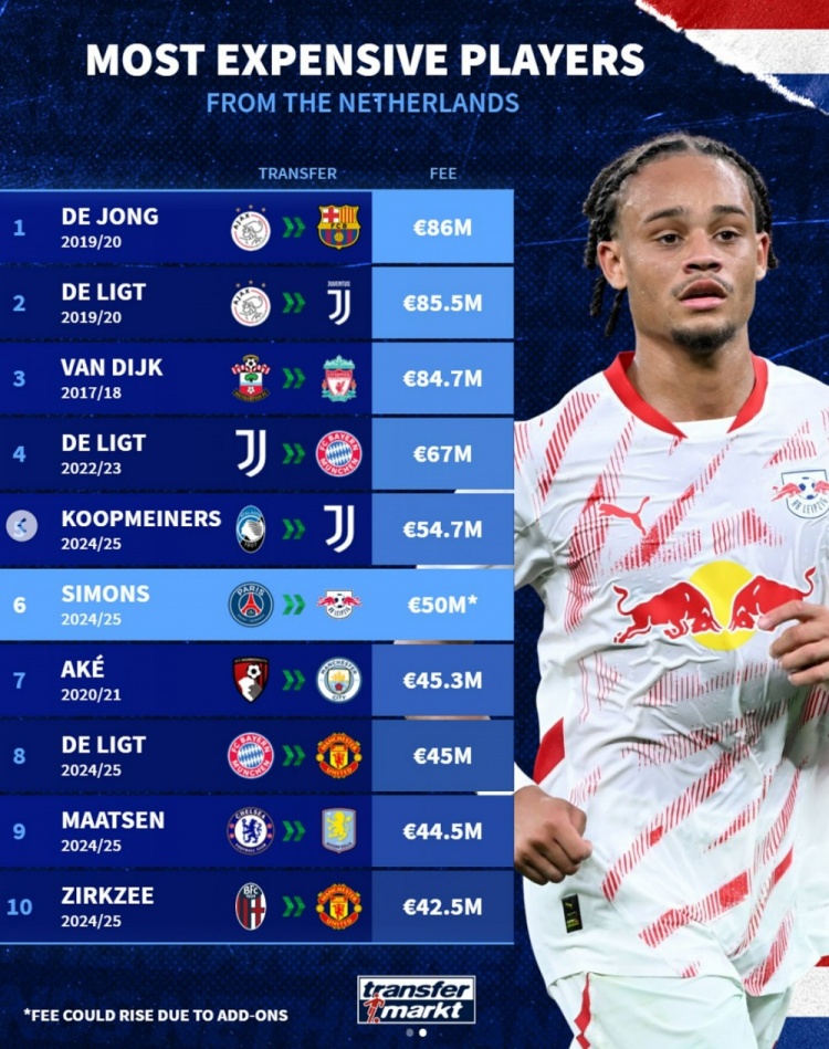 1月31日訊 哈維-西蒙斯正式從巴黎轉(zhuǎn)會(huì)萊比錫,固定轉(zhuǎn)會(huì)費(fèi)5000萬(wàn)歐,另外還有3000萬(wàn)歐浮動(dòng)獎(jiǎng)金。德轉(zhuǎn)盤點(diǎn)了荷蘭球員歷史轉(zhuǎn)會(huì)費(fèi)榜,具體如下(只統(tǒng)計(jì)固定轉(zhuǎn)會(huì)費(fèi)):