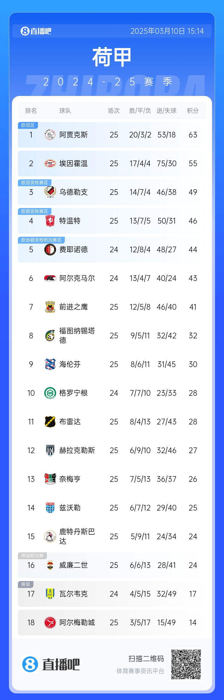 03月10日訊 在昨晚結(jié)束的荷甲第25輪中,阿賈克斯1-0擊敗茲沃勒,豪取荷甲10連勝,肯尼斯-泰勒點射制勝,華裔中場菲慈佔-天樂先發(fā)出戰(zhàn)70分鐘。本賽季在35歲的意大利少帥法雷奧利的帶領(lǐng)下,阿賈克斯還剩9輪8分領(lǐng)跑荷甲積分榜,有望時隔2個賽季重奪荷甲冠軍。荷甲積分榜↓ 本文標簽: 足球 五洲 荷甲