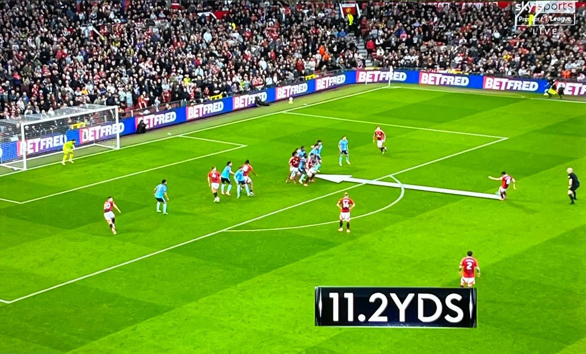 而賽中的轉播鏡頭也刻意給出了數(shù)字,鏡頭顯示,B費的罰球點距離阿森納的人墻足足有11.2碼(約為10.24米),而規(guī)則要求的人墻與罰球點距離一般只有10碼(9.15米)。