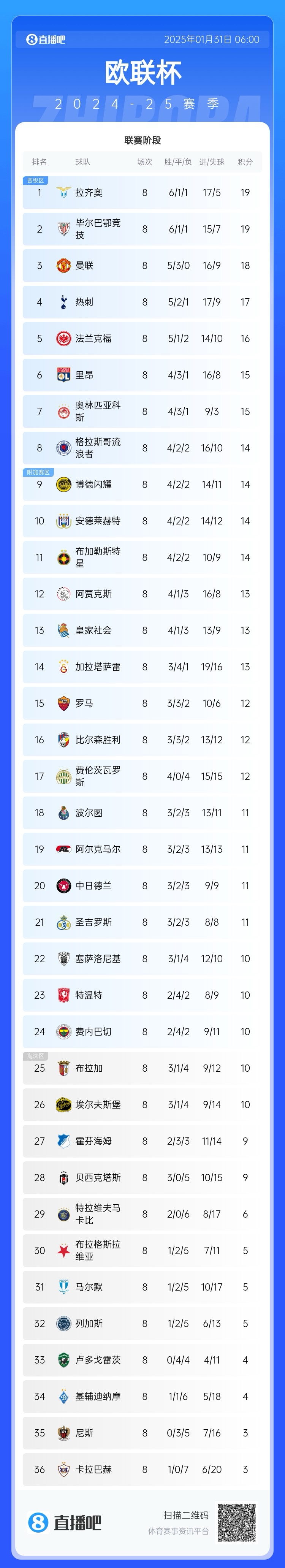 1月31日訊 歐聯(lián)杯聯(lián)賽階段收官,最新積分榜情況出爐!