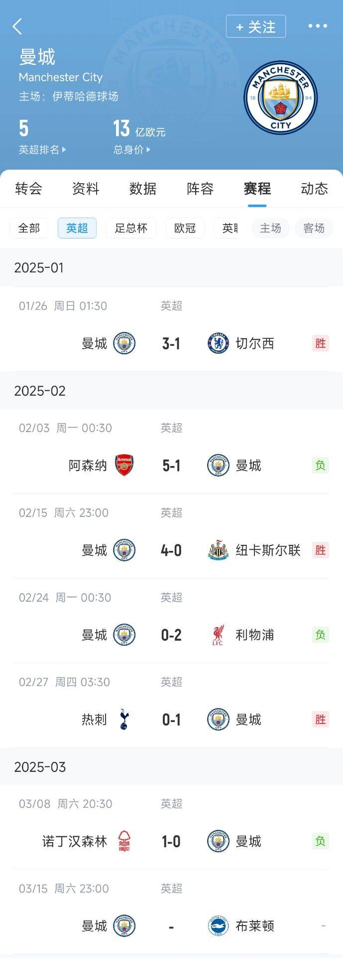 曼城在上周末的英超0-1不敵森林,近6輪比賽3勝3負(fù)。這6輪的魔鬼賽程,曼城對(duì)陣的對(duì)手分別是英超第4切爾西,第2阿森納,第6紐卡,第1利物浦,第13熱刺,第3森林。3勝3負(fù)對(duì)于這賽季的曼城來說完全可以接受,而接下來他們將迎來魔鬼賽程的最后一戰(zhàn):第7布萊頓。 本文標(biāo)簽: 足球 英超 曼城