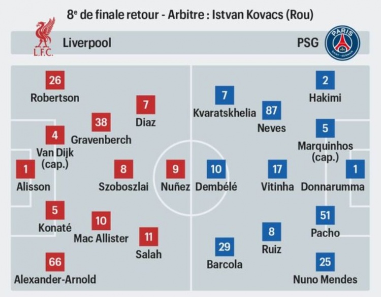3月11日訊 北京時間明天凌晨,歐冠1/8決賽次回合,利物浦主場對陣巴黎?!栋屠枞藞蟆奉A測了本場比賽的兩隊首發(fā)陣容。