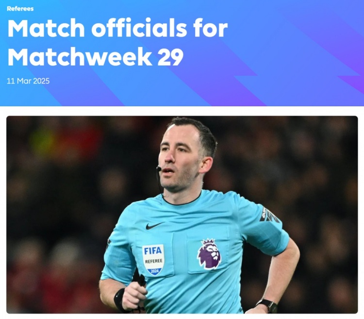 3月11日訊 英超官方公布第29輪聯(lián)賽各場執(zhí)法裁判,克里斯-卡瓦納(上圖)執(zhí)法阿森納vs切爾西,西蒙-胡珀執(zhí)法曼城vs布萊頓。