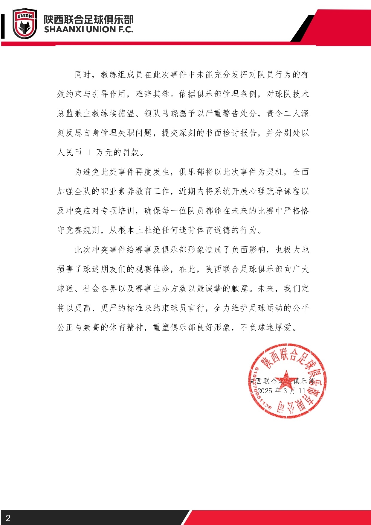 此次沖突事件給賽事及俱樂部形象造成了負(fù)面影響,也極大地?fù)p害了球迷朋友們的觀賽體驗(yàn),在此,陜西聯(lián)合足球俱樂部向廣大球迷、社會(huì)各界以及賽事主辦方致以最誠摯的歉意。未來,我們定將以更高、更嚴(yán)的標(biāo)準(zhǔn)來約束球員言行,全力維護(hù)足球運(yùn)動(dòng)的公平公正與崇高的體育精神,重塑俱樂部良好形象,不負(fù)球迷厚愛。
