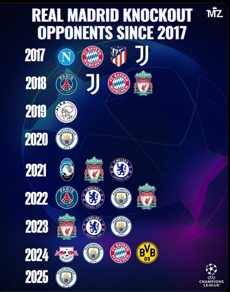 外媒也列出皇馬自2017年以來(lái)在歐冠淘汰賽所有對(duì)手,除了2019年的阿賈克斯之外均為五大聯(lián)賽球隊(duì),具體如下:
