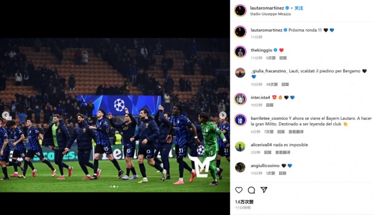 勞塔羅曬出全隊賽后奔向球迷的慶祝照,并配文:“晉級下一輪!”
