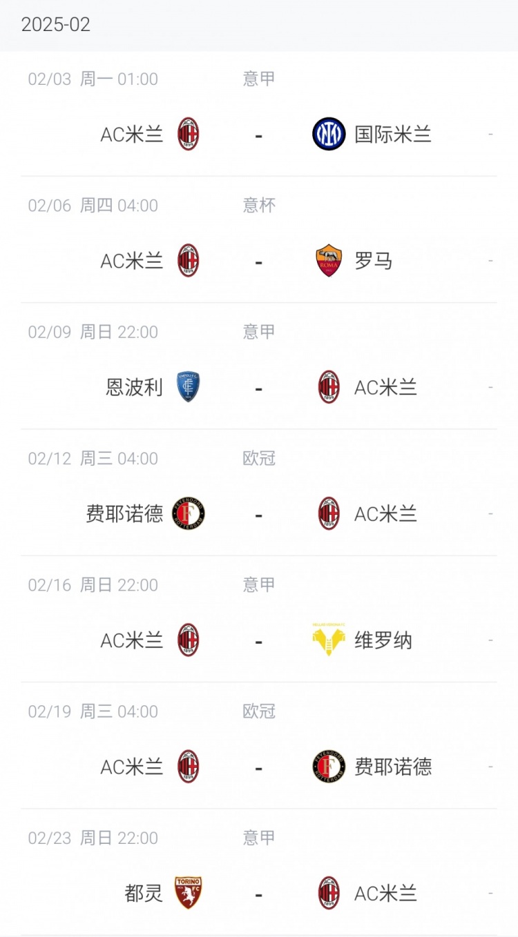 1月31日訊 歐冠附加賽抽簽結(jié)束,AC米蘭將迎戰(zhàn)費(fèi)耶諾德。米蘭2月份賽程如上圖。其中,北京時間2月3日將迎來本賽季意甲第二次米蘭德比,3天后的2月6日在意大利杯迎戰(zhàn)羅馬;12日和19日在歐冠附加賽迎戰(zhàn)費(fèi)耶諾德,AC米蘭先客后主。 本文標(biāo)簽: 足球 意甲 AC米蘭 國際米蘭 羅馬 歐冠