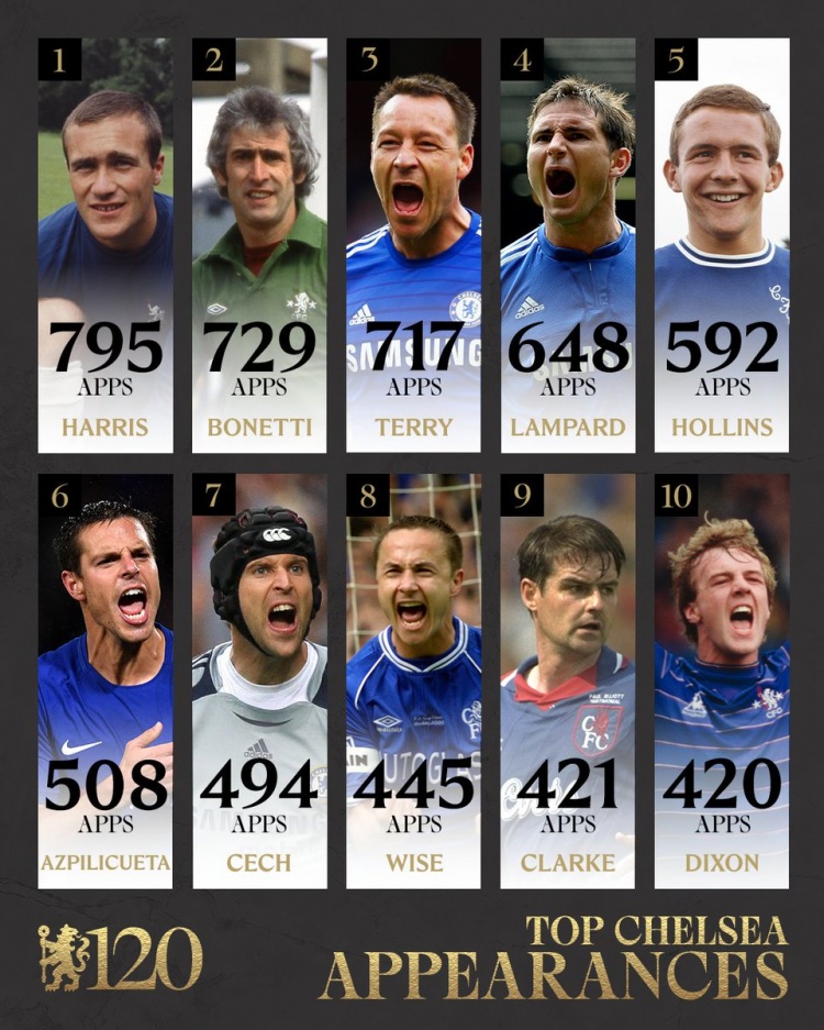 3月12日訊 切爾西俱樂部成立120周年,球隊官方社媒曬截至目前球員代表球隊出場次數(shù)榜,羅恩-哈里斯第一,特里第三,蘭帕德第四,AZP第六,切赫第七。