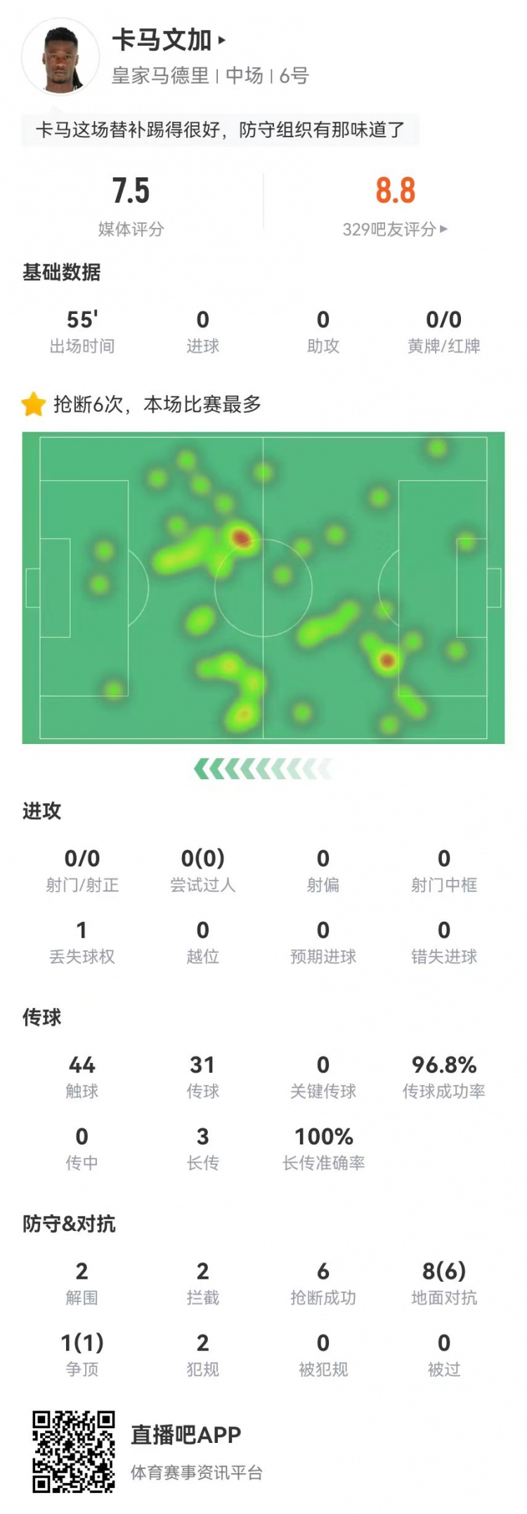 3月13日訊 皇馬在本輪歐冠點球淘汰馬競,卡馬文加數(shù)據(jù)如下:替補出戰(zhàn)55分鐘44觸球31傳球、30成功,成功率97%3長傳、3成功9對抗、7成功1丟失球權(quán)2犯規(guī)2解圍2攔截6搶斷0被過獲評7.5分 本文標(biāo)簽: 足球 西甲 皇家馬德里 馬德里競技 歐冠