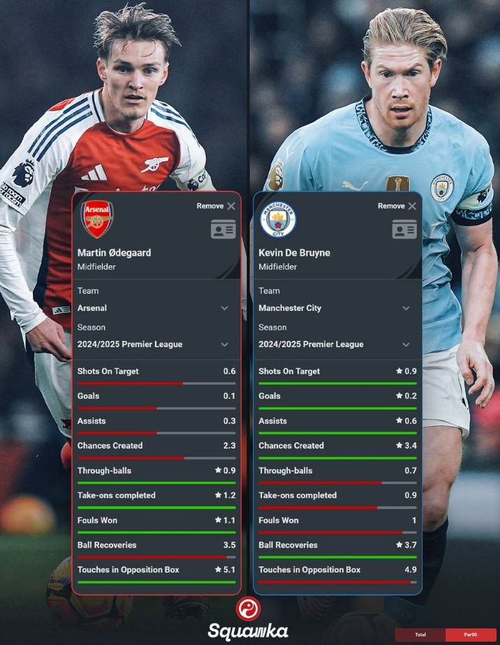 1月31日訊 本周末英超將迎來(lái)阿森納與曼城的焦點(diǎn)戰(zhàn),數(shù)據(jù)網(wǎng)站Squawka也盤(pán)點(diǎn)了兩隊(duì)中場(chǎng)指揮官厄德高、德布勞內(nèi)本賽季在英超每90分鐘數(shù)據(jù)對(duì)比,具體如下: