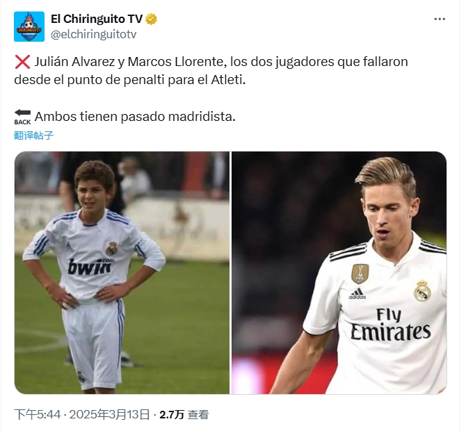 西班牙六臺曬出兩人舊照,表示這兩名球員都曾身穿皇馬球衣,阿爾瓦雷斯11歲時(shí)曾參加皇馬的試訓(xùn),但并未加盟。略倫特則是出自皇馬青訓(xùn),在2019年以3000萬轉(zhuǎn)會費(fèi)加盟馬競。