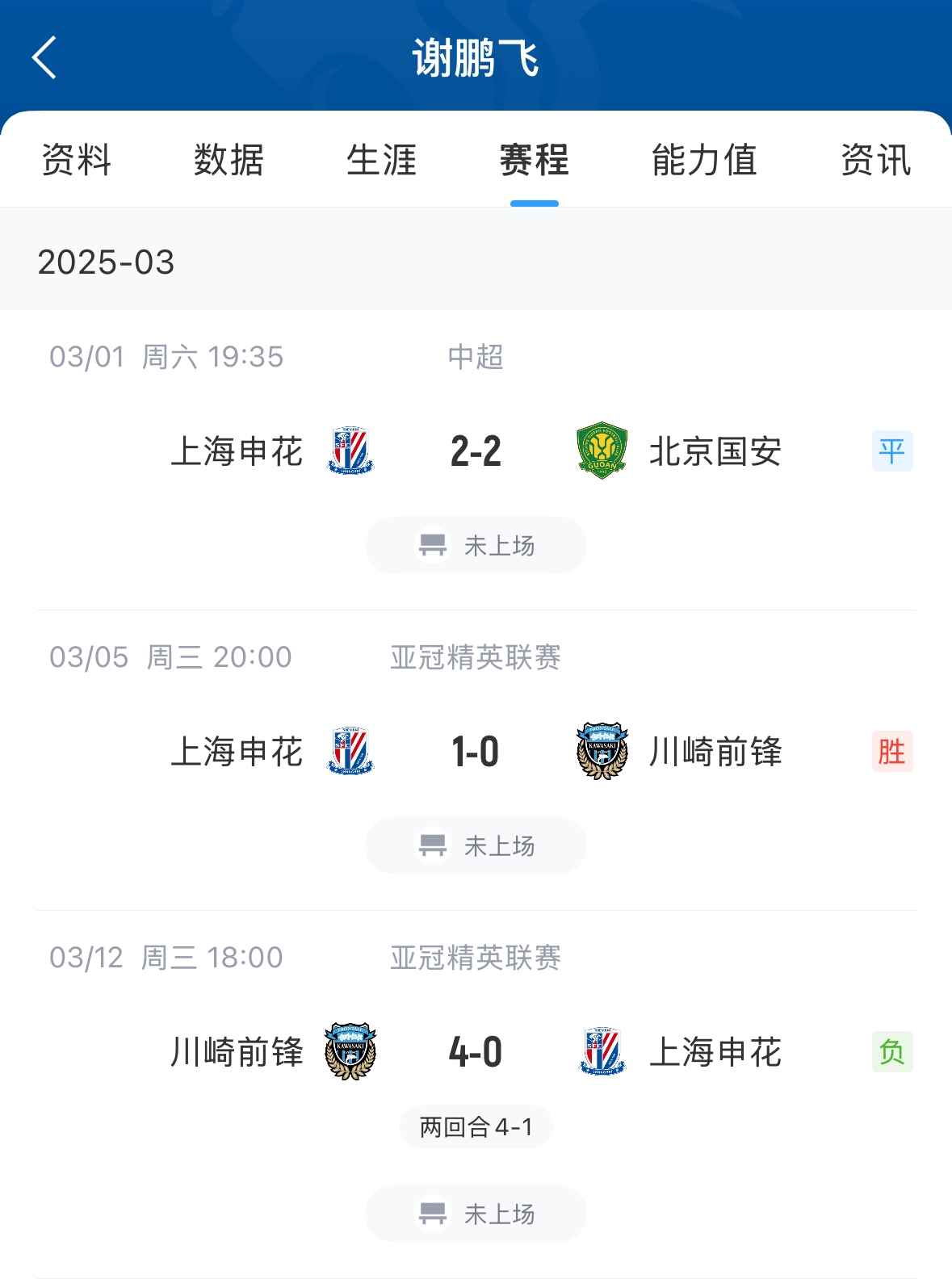 03月13日訊 昨日亞冠,申花不敵川崎前鋒無緣晉級。謝鵬飛本場比賽替補未出場,謝鵬飛今年6月底滿32歲,本賽季目前代表申花只出場1次出場時間26分鐘,其余幾場比賽均未出場。據(jù)德轉(zhuǎn)數(shù)據(jù)統(tǒng)計,上賽季謝鵬飛代表申花出場35次,打進4球送出7次助攻。 本文標簽: 足球 中超 中國足球 上海申花