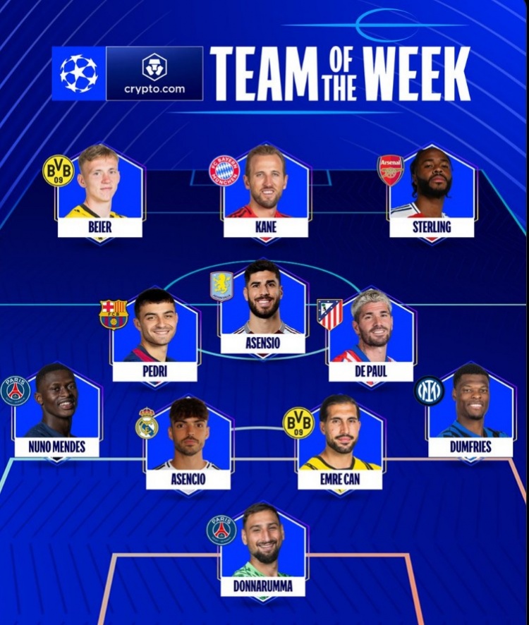 3月14日訊 本輪歐冠戰(zhàn)罷,歐冠官方也評(píng)選出本輪比賽最佳陣容,凱恩、佩德里領(lǐng)銜,具體陣容如下: