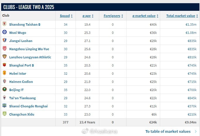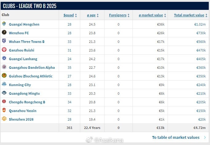 2025賽季中乙各隊(duì)名單已在轉(zhuǎn)會市場網(wǎng)更新。球隊(duì)總身價(jià)方面,山東泰山B隊(duì)以135萬歐元列第一,后面依次是無錫吳鉤(108萬歐)、廣西恒宸(102萬歐)、江西廬山(83.5萬歐)、杭州臨平吳越(83.5萬歐)、蘭州隴原競技(81萬歐)、上海海港B隊(duì)(74.5萬歐)、湖北青年星(74.5萬歐)、溫州(73萬歐)、南通海門珂締緣(71.5萬歐)、北京理工(70萬歐)、泰安天貺(64.5萬歐)、武漢三鎮(zhèn)B隊(duì)(56萬歐)、贛州瑞獅(47萬歐)、廣西藍(lán)航(40.5萬歐)、山西崇德榮海(37萬歐)、廣州蒲公英(36萬歐)、貴州筑城競技(35萬歐)、昆明城市(24萬歐)、廣東銘途(21萬歐)、長春喜都(21萬歐)、成都蓉城B隊(duì)(20.5萬歐)、泉州亞新(15萬歐)、深圳二零二八(2萬歐)。