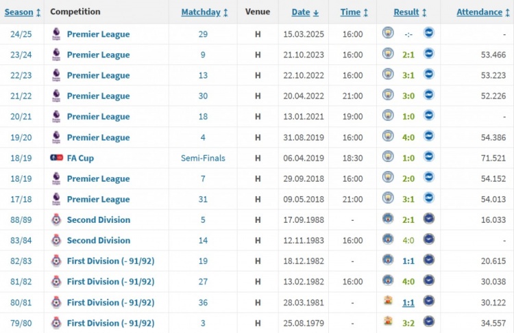 3月15日訊 北京時間今晚11點,英超第29輪曼城將主場對陣布萊頓。據德轉數據統(tǒng)計,歷史上曼城曾在各項賽事14次主場對陣布萊頓,取得12勝2平的戰(zhàn)績,共計打進34球,丟8球。 本文標簽: 足球 英超 曼城