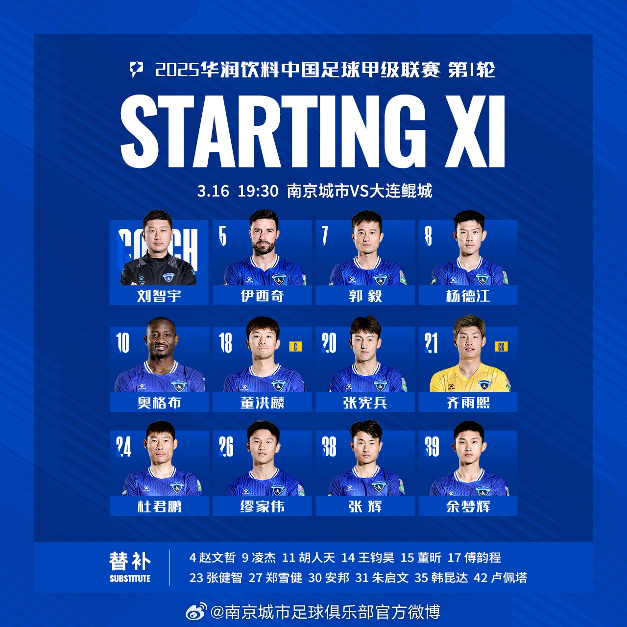 南京城市2025賽季首戰(zhàn)首發(fā)名單出爐!