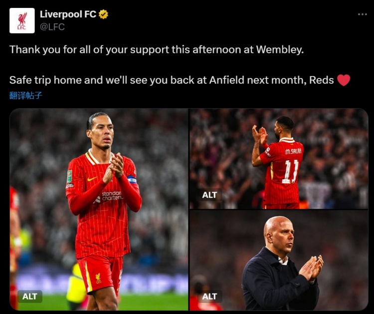 利物浦官推也在賽后感謝了球迷:“感謝你們今天下午在溫布利的支持。安全回家。紅軍們,我們下個月安菲爾德再見?!?/p>