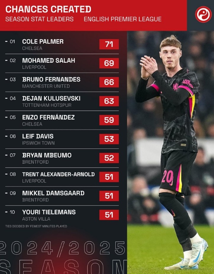 3月17日訊 數(shù)據(jù)網(wǎng)站Squawka盤點(diǎn)了本賽季英超創(chuàng)造機(jī)會榜,其中帕爾默以71次居首,不過他自去年12月對陣維拉之后還沒有送出過助攻。具體創(chuàng)造機(jī)會榜如下:
