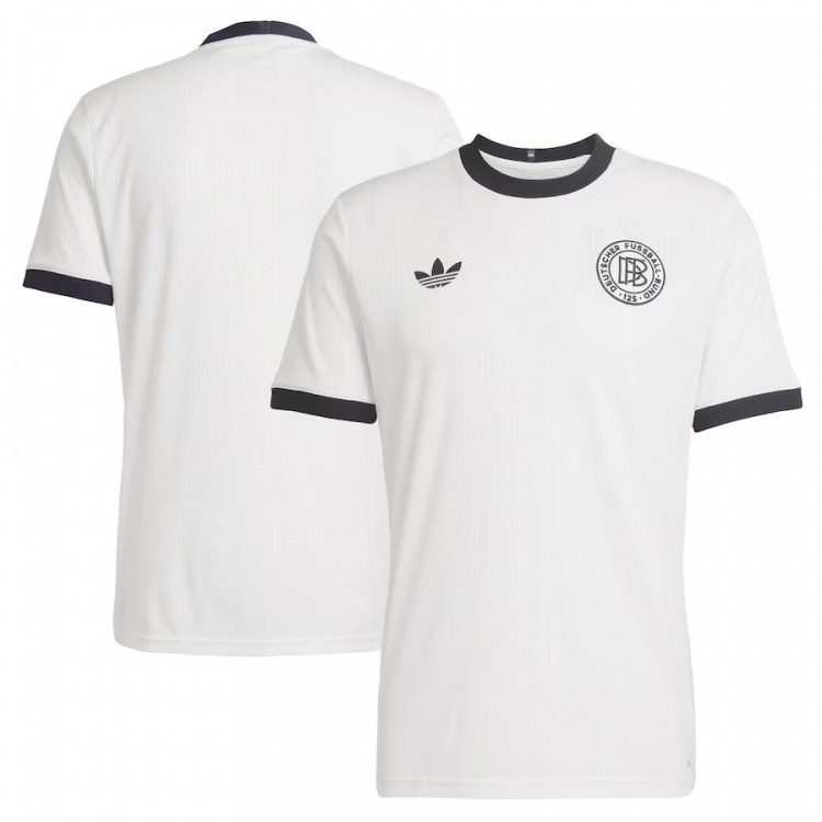 紀念球衣的設計以1974年復古球衣為藍本——這一年,德國男足國家隊在本土贏得了世界杯冠軍。125周年紀念球衣的配色和剪裁均承載著德國足協(xié)的歷史:球員版球衣采用經(jīng)典的黑白配色,而守門員球衣則為淡藍色。球衣采用細條紋面料,搭配袖口、圓領(lǐng)衣領(lǐng)以及衣領(lǐng)后方的旗幟印花。球衣胸前繡有阿迪達斯的三葉草標志,以及特別為德國足協(xié)成立125周年設計的刺繡徽章,而該徽章的涉及靈感來自德國足協(xié)在萊比錫成立地所懸掛的紀念牌匾。
