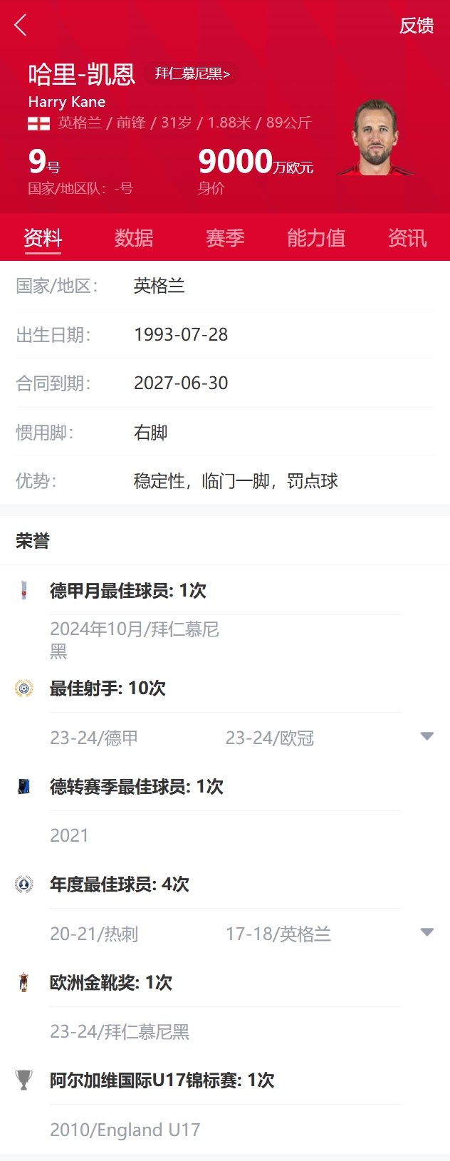 現(xiàn)年31歲的凱恩職業(yè)生涯攻入400多粒進(jìn)球、斬獲數(shù)十項(xiàng)個人榮譽(yù),但至今還未隨球隊(duì)奪得過主要賽事冠軍。
