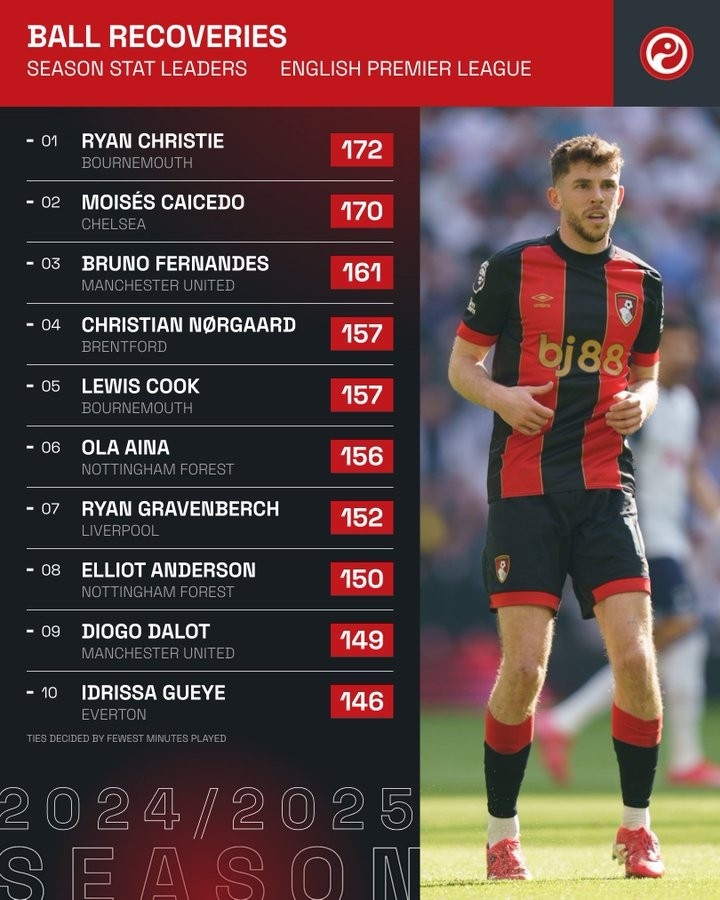 本賽季英超贏得球權(quán)榜: