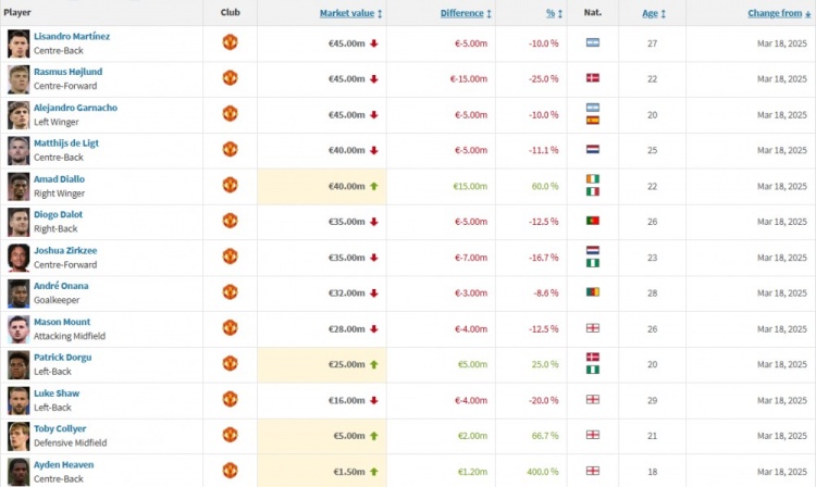 3月18日訊 德轉(zhuǎn)更新了部分英超球員身價(jià),在此次更新中有13位曼聯(lián)球員身價(jià)發(fā)生了變化,其中9人出現(xiàn)下跌,4人出現(xiàn)上漲。